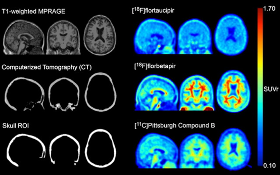 高放射性示蹤劑頭骨結(jié)合的淀粉樣蛋白陰性參與者的MR、CT和標準化攝取值比率(SUVr)圖像。圖像在MNI-152空間。圖片由《核醫(yī)學雜志》提供。