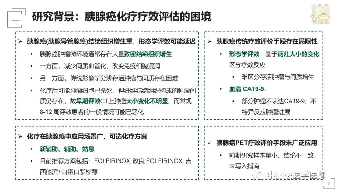 研究背景:胰腺導管腺癌,通常簡稱為胰腺癌,其腫瘤微環境中常存在大量的致密結締組織增生,腫瘤與間質交織,在傳統影像學如CT和常規核磁上區分較困難,化療后可能腫瘤細胞已殺死、但纖維結締組織構成的腫瘤間質仍存在,特別是在治療后的早期,病灶的總體大小變化可能并不明顯。胰腺癌的治療手段中化療占重要地位,化療可應用在新輔助治療、輔助治療及晚期患者姑息治療的多種場景下,目前推薦的化療方案包括FOLFIRINOX, 改良 FOLFIRINOX, 吉西他濱+白蛋白紫杉醇等。胰腺癌化療后利用形態學評效可能難區分存活腫瘤與間質增生;臨床常用的血清CA199評效,敏感性與特異性不足。而利用FDG PET進行胰腺癌療效評價,由于前期研究樣本量小、結論不一致,尚未廣泛應用。