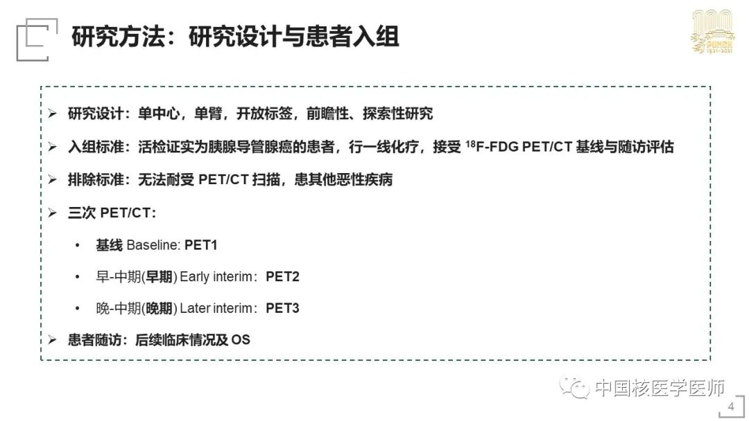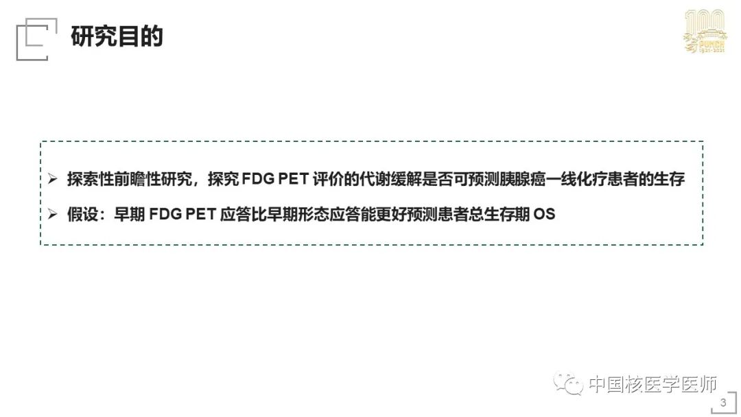 因此,這項探索性前瞻性研究,試圖探究 FDG PET 評價的代謝緩解是否可預測胰腺癌一線化療患者的生存,提出的假設是早期代謝應答比早期形態應答能更好預測患者總生存期(OverallSurvival, OS)。