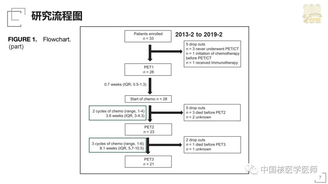 第六個疑問是評效時間與化療療程數的差異,PET1-PET2,PET2-PET3間復查的時間間隔與療程數差異較大,更嚴格地定義早期和晚期評效時間點是有必要的。