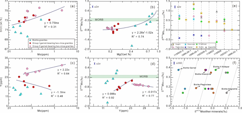 圖1. 正嘎花崗巖全巖Mo體系與元素相關(guān)性(a-d)及礦物-全巖(e)、礦物-礦物(f)間Mo同位素分餾圖解