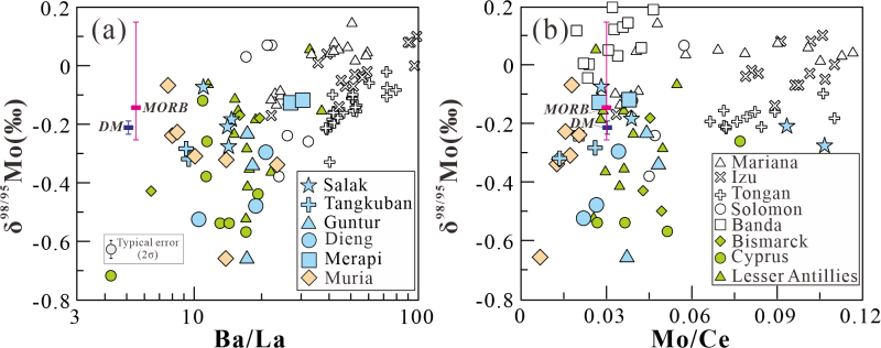 圖2. 爪哇島弧玄武巖與弧后玄武巖Mo同位素及Ba/La與Mo/Ce比特征