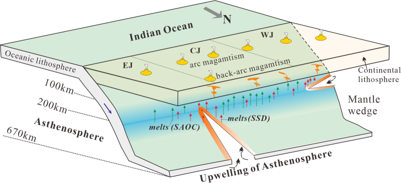 爪哇島弧玄武巖Mo-Sr-Nd-Hf-Pb同位素組成在沿弧方向上的變化(圖4),反映了其地幔源區俯沖組分的差異性。地球物理資料顯示爪哇島弧下的俯沖板片發生了板片撕裂,并導致了軟流圈地幔沿板片窗的上涌(圖5)。軟流圈地幔上涌加劇了板片窗附近俯沖沉積物的熔融(圖5)。本次研究表明俯沖板片的結構對島弧巖漿地球化學成分具有重要的控制作用。