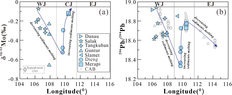 研究結果表明爪哇島弧玄武巖(CAB)以鈣堿性系列為主,而弧后玄武巖(BAB)則具有更高的K2O含量,為鉀玄質。島弧玄武巖與弧后玄武巖具有相似的Mo同位素組成(圖2),表明其Mo同位素變化不是由俯沖過程中的同位素分餾造成的,而反映了其地幔源區受到了不同類型俯沖組分的交代。島弧玄武巖與弧后玄武巖均具有低Ba/La與Mo/Ce比的特征(圖2),表明其地幔源區較少受流體交代,而主要受來自俯沖板片的熔體交代。