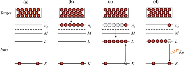 圖3.內(nèi)殼多電子激發(fā)模型。(a)初始態(tài),(b)入射離子電子俘獲中性化,(c)內(nèi)殼多電子激發(fā)過程,(d)入射離子K殼x射線發(fā)射。(圖/王偉)