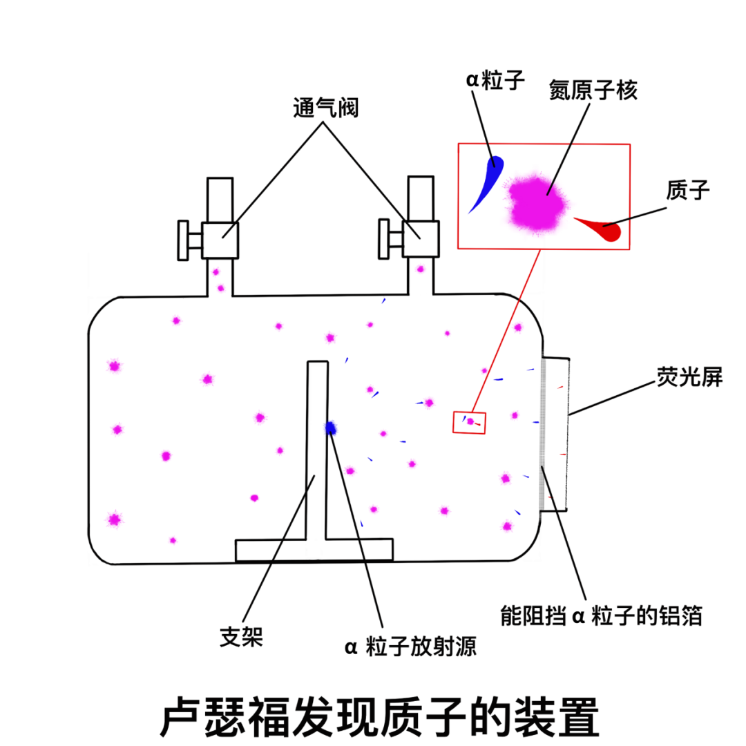 既然原子是可以繼續再分的,那么原子核呢?原子核內部有沒有結構?1919年,盧瑟福使用α粒子轟擊氮原子核。所謂的轟擊,形象的來說就像是一群人手拉手待在一起,然后從遠處跑來一個人突然沖入人群,把其中一個或者幾個人撞了出去。實驗中,他發現有一種未知的粒子穿透了恰好能阻止α粒子出射的鋁箔,并在鋁箔后方的熒光屏上打出了亮點。他將這種粒子引入電場與磁場中,計算出了這種未知粒子的質量與電荷,發現這種未知粒子的質量與最輕的元素——氫元素的原子質量是一致的,并且這種粒子攜帶著正電荷,盧瑟福將這種新發現的粒子命名為質子。轟擊原子核示意圖(繪圖:史金陽)