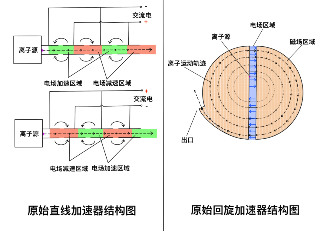 既然如此,我們就需要尋找一些具有高能量的炮彈才行。科學家們開始尋找一些更高能的粒子作為實驗中的炮彈。科學家們首先注意到宇宙中的射線具有比天然放射源更高的能量,借此發現了攜帶正電荷的電子,即正電子。科學家們意識到一條非常常見的規律,那就是離子(帶電粒子的統稱)在電場中會加速,在相同路徑下,電場越強,離子獲得的能量就越高,由此科學家們發明了直線加速器。更進一步,離子在磁場中會轉彎,如果讓帶電粒子在電場中加速然后導入磁場中,我們就可以通過控制電場與磁場的強弱來控制離子的能量與方向了。之后再讓磁場將離子軌道彎曲成一個環形,那么離子將再次回到電場,重復被電場加速。根據這樣的構想就有了最初的回旋加速器的設想。