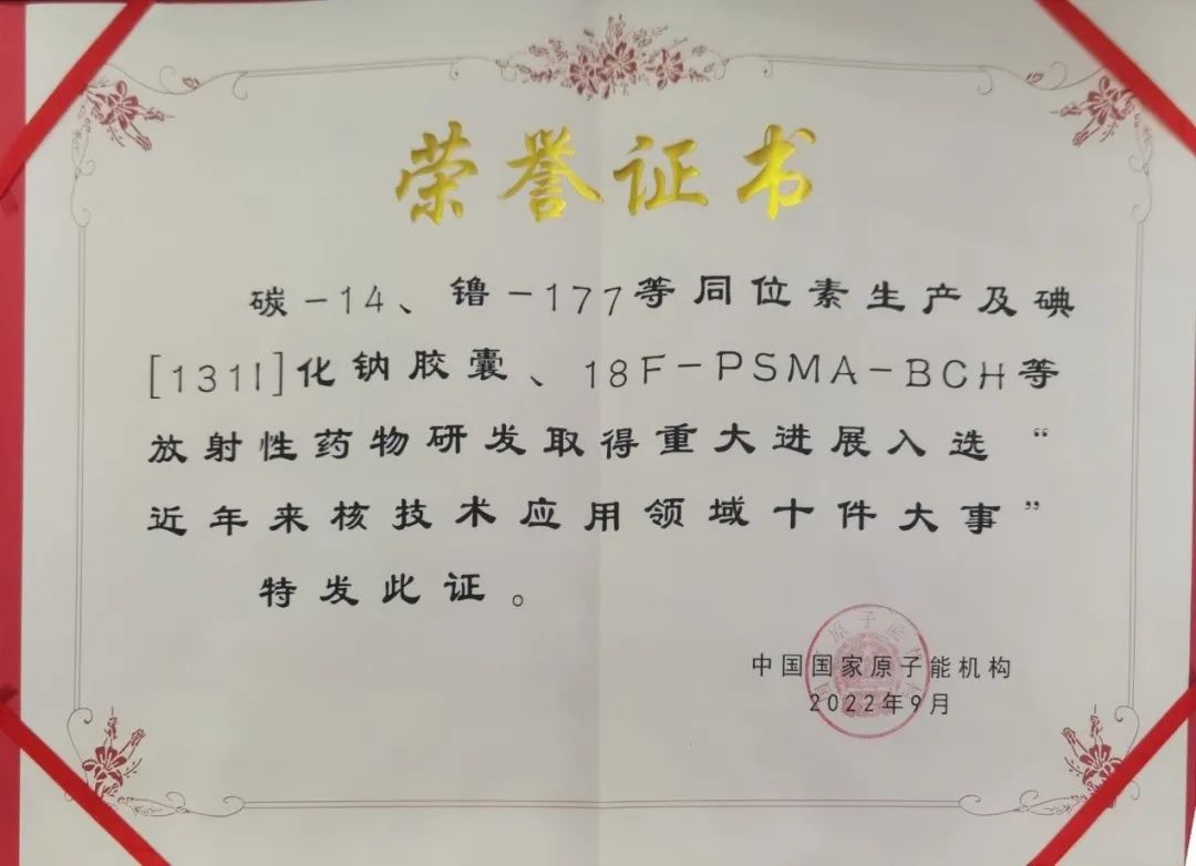 2022年9月21日,國家原子能機構在京舉辦2022年第三季論壇,發布“近年來核技術應用領域十件大事”,展示了核技術近年來在國民經濟領域的重大應用成果。中物院核物理與化學研究所組織攻關成功填補國內空白的自主化無載體Lu-177同位素生產成果得以入選。