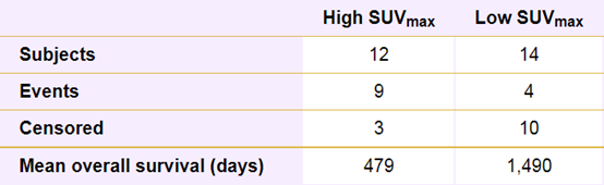 與低組(中位1490天或48.6個(gè)月,p=0.01)相比,高SUVmax組的存活率較低(中位479天或15.7個(gè)月)。