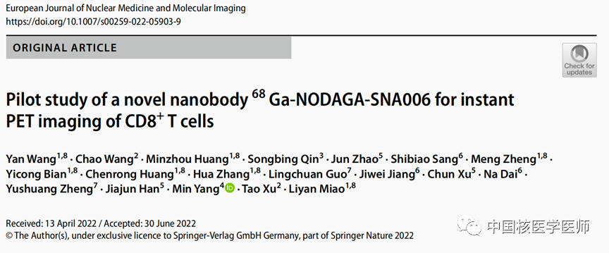 SNA006為智核生物自主研發的以68Ga標記單域抗體靶向CD8+T細胞的顯影劑,也是國內首個獲得臨床數據的放射性核素顯影劑。SNA006只與人T細胞的CD8受體特異性結合,1-2小時即可獲得全身靶病灶內CD8+ T細胞的正電子發射斷層掃描(PET)成像結果。SNA006結合PET/CT是打破傳統有創式的免疫組化方式監測CD8+T細胞的創新型診斷方法。目前蘇州大學附屬第一醫院繆麗燕團隊發起的IIT試驗已完成。相關研究發表在多篇高質量、高影響因子的學術期刊J Nanobiotechnol和EJNMMI上。