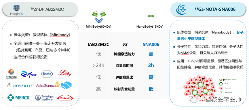 國際上關于CD8分子顯影劑研究火爆,如美國ImaginAb公司的89Zr crefmirlimab berdoxam產品--89Zr標記minibody靶向CD8+T細胞的分子顯影劑,在完成Phase I后就與國際多個腫瘤免疫公司和放射性藥物公司達成多項合作,涉及領域包括腫瘤疫苗、免疫激動劑、細胞治療等。蘇州智核生物開發的68Ga標記單域抗體相比于ImaginAb的89Zr標記minibody更具有優勢,如下圖所示: