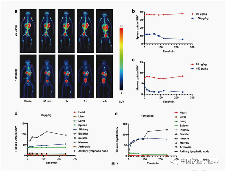 兩只食蟹猴均注射了45-55 MBq的SNA006后,其中一只注射25 μg/kg的SNA006,另外一只注射150μg/kg的SNA006,給藥后立即進行PET/CT成像。結果顯示(圖7),SNA006主要保留在CD8豐富的組織中,如脾臟、骨髓和淋巴結,而在CD8貧乏的組織中,如大腦、肺部和肌肉,放射性攝取較低。當SNA006劑量從25μg/kg增加到150μg/kg時,脾臟的濃度減少了90%以上,這說明SNA006在體內可以特異性靶向CD8,且結合能力較佳。