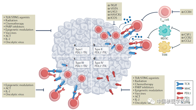 如圖所示,若既有PDL1表達又有T細胞浸潤,則為對PD(L)1治療有應答的II型腫瘤。然而,腫瘤浸潤淋巴細胞(TILs)尤其是CD8+ T細胞,還未被用作預測生物標志物來選擇患者。比如IV型腫瘤不存在T細胞浸潤,抗PD(L)1治療也不會產生反應,所以抗PD(L)1治療的最初耐藥不能僅根據PDL1陽性與否來確定,將CD8+ T細胞用作預測生物標志物來選擇患者更為重要。腫瘤內PDL1+或CD8+的表達水平具有時空異質性且易受治療影響。傳統臨床檢測方式為免疫組化,但因局部取樣方式和治療過程等因素,不能全面、精準的反映PDL1+/CD8+T細胞的水平。使用放射性核素標記單域抗體進行體內成像,可避免多次穿刺活檢,且能夠實時、動態監測全身和腫瘤組織內PDL1+/CD8+T細胞數量的變化,或是未來精準檢測的新方法。此外,該檢測方式具有明顯的臨床價值: