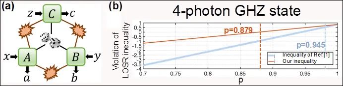在量子資源理論中,LOCC并不是唯一可以用來定義糾纏資源的免費操作,在去除經典通信后,一個更為自然的定義是基于LOSR的理論框架。在實驗中,研究組先驗證了三體糾纏結構的非局域性。該三體系統的LOSR局域模型允許三體之間具有共享隨機性,并允許對任意兩體之間的關聯不設限,即允許其關聯可以是量子關聯,也可以具有更為廣泛的不依賴量子力學描述的廣義概率理論(Generalized probabilistic theory)所允許的關聯。研究組聯合Marc-Olivier Renou等人對此前相關理論工作中提出的LOSR非局域性不等式進行改進,針對多光子實驗中常見的白噪聲提出了魯棒性更強的不等式,并在實驗中利用自主研制的“三明治型”高保真度多光子糾纏源[PRL115, 260402 (2015)]以26.3個標準差的違背驗證了真三體LOSR非局域性。研究組進一步在四體情形實驗違背了真四體LOSR不等式,實驗排除了基于共享隨機性和三體廣義關聯的局域性模型,展示了真四體非局域性。這些實驗結果表明僅兩體或三體非局域關聯無法解釋自然界產生的所有關聯。該工作中提出的不等式可以拓展到任意N體情形,而制備高保真度糾纏源的方法為實驗展示更大量子系統非局域性打下基礎。