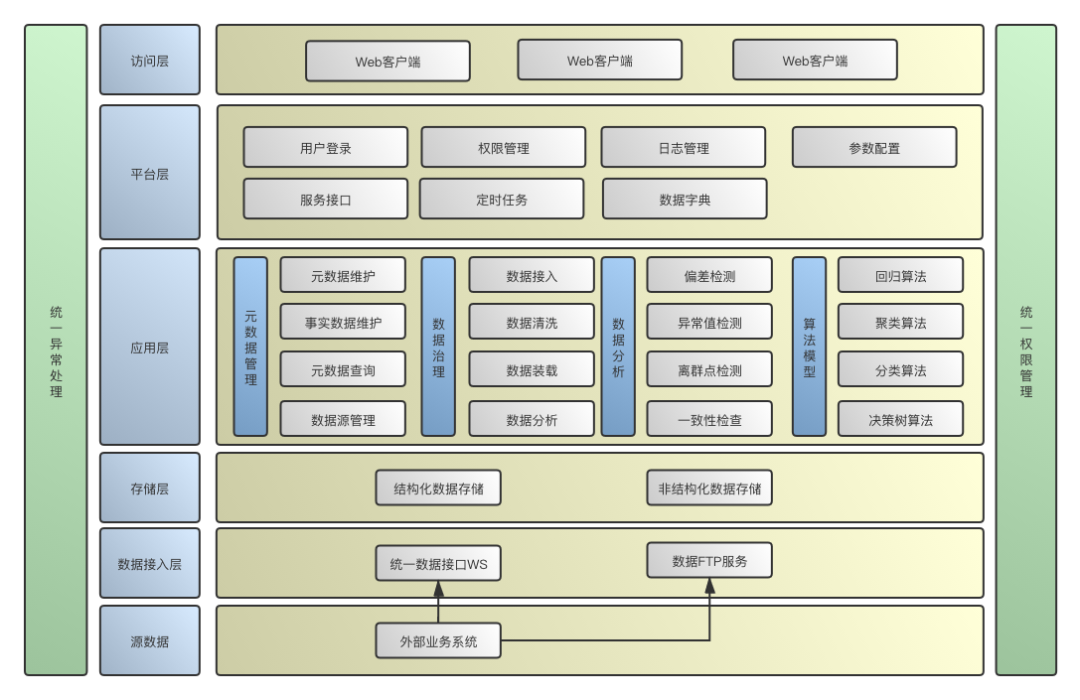 2.3.1 反應(yīng)堆大數(shù)據(jù)系列標(biāo)準(zhǔn)研究基于我國(guó)反應(yīng)堆大數(shù)據(jù)技術(shù)、產(chǎn)業(yè)發(fā)展現(xiàn)狀以及國(guó)內(nèi)外工業(yè)大數(shù)據(jù)標(biāo)準(zhǔn)化基礎(chǔ),結(jié)合大數(shù)據(jù)在反應(yīng)堆工程領(lǐng)域應(yīng)用特點(diǎn)、典型應(yīng)用場(chǎng)景以及未來(lái)發(fā)展趨勢(shì),開(kāi)展反應(yīng)堆大數(shù)據(jù)系列標(biāo)準(zhǔn)研究。(1)反應(yīng)堆大數(shù)據(jù)基礎(chǔ)標(biāo)準(zhǔn)規(guī)范。制定統(tǒng)一的術(shù)語(yǔ)和參考模型,統(tǒng)一和規(guī)范反應(yīng)堆大數(shù)據(jù)領(lǐng)域的通用術(shù)語(yǔ)及其定義,規(guī)范反應(yīng)堆大數(shù)據(jù)的基礎(chǔ)架構(gòu)和研究范圍,解決反應(yīng)堆大數(shù)據(jù)基礎(chǔ)共性關(guān)鍵問(wèn)題。(2)反應(yīng)堆大數(shù)據(jù)技術(shù)標(biāo)準(zhǔn)規(guī)范。制定標(biāo)準(zhǔn)化的反應(yīng)堆大數(shù)據(jù)在某一應(yīng)用場(chǎng)景內(nèi)從產(chǎn)生到其使用、終止(回收)這一過(guò)程的關(guān)鍵技術(shù),規(guī)范涵蓋反應(yīng)堆大數(shù)據(jù)全生命周期處理和互聯(lián)互通技術(shù)的反應(yīng)堆大數(shù)據(jù)關(guān)鍵技術(shù);(3)反應(yīng)堆大數(shù)據(jù)管理標(biāo)準(zhǔn)規(guī)范。制定針對(duì)反應(yīng)堆工程數(shù)據(jù)質(zhì)量相應(yīng)的指標(biāo)要求和規(guī)格參數(shù)的數(shù)據(jù)質(zhì)量標(biāo)準(zhǔn)規(guī)范,確保反應(yīng)堆工程數(shù)據(jù)在產(chǎn)生、存儲(chǔ)、交換和使用等各個(gè)環(huán)節(jié)中的質(zhì)量水平;(4)反應(yīng)堆大數(shù)據(jù)應(yīng)用標(biāo)準(zhǔn)規(guī)范。制定反應(yīng)堆大數(shù)據(jù)平臺(tái)/工具標(biāo)準(zhǔn)規(guī)范,對(duì)反應(yīng)堆大數(shù)據(jù)存儲(chǔ)、處理、分析、融合等系統(tǒng)或工具從技術(shù)架構(gòu)、功能要求、性能規(guī)范、平臺(tái)接口、管理維護(hù)等方面進(jìn)行規(guī)范。2.3.2反應(yīng)堆大數(shù)據(jù)基礎(chǔ)平臺(tái)開(kāi)發(fā)以我國(guó)反應(yīng)堆大數(shù)據(jù)標(biāo)準(zhǔn)及應(yīng)用研究為基礎(chǔ),結(jié)合反應(yīng)堆大數(shù)據(jù)的發(fā)展與應(yīng)用趨勢(shì),進(jìn)行反應(yīng)堆大數(shù)據(jù)基礎(chǔ)平臺(tái)的建設(shè)工作,開(kāi)展反應(yīng)堆大數(shù)據(jù)智能采集技術(shù)研究、數(shù)據(jù)治理技術(shù)研究、分布式存儲(chǔ)技術(shù)研究、智能分析技術(shù)研究、反應(yīng)堆大數(shù)據(jù)技術(shù)架構(gòu)研究。圖1 反應(yīng)堆大數(shù)據(jù)基礎(chǔ)平臺(tái)功能架構(gòu)圖在此基礎(chǔ)上,采用B/S架構(gòu),開(kāi)發(fā)反應(yīng)堆大數(shù)據(jù)基礎(chǔ)平臺(tái),平臺(tái)能夠簡(jiǎn)單高效的對(duì)反應(yīng)堆多源異構(gòu)數(shù)據(jù)進(jìn)行治理和分析,能夠以可視化的形式更直觀(guān)的展示出計(jì)算結(jié)果,以便工作人員更加方便的管理與分析多源異構(gòu)的數(shù)據(jù),并進(jìn)一步開(kāi)展數(shù)據(jù)的深度應(yīng)用。