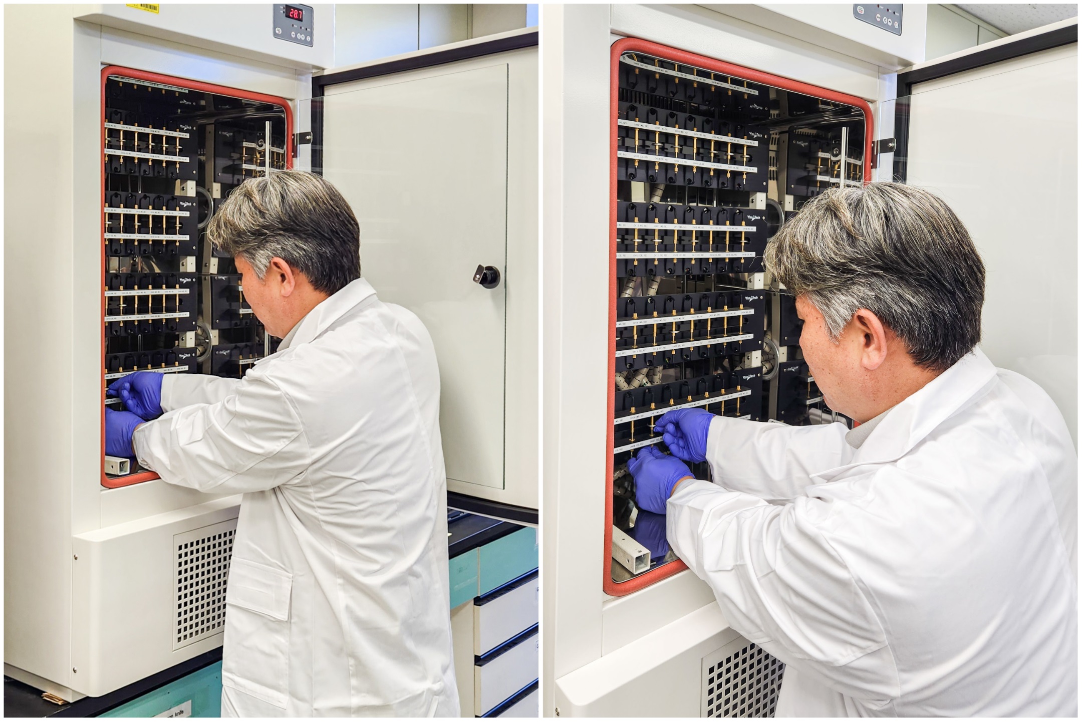 照片 1-1、1-2。由韓國原子能研究所的Chan-hee Jeong博士領導的一個研究小組正在對使用電子束制造的半固態(tài)鋰離子電池進行長期穩(wěn)定性評估測試。
