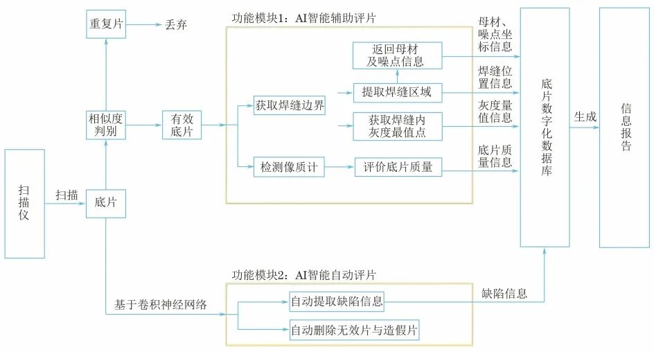 人工智能評片系統框架如下圖所示,可見通過掃描儀獲得待處理的原始底片后,需要經過相似度判別其是否為有效底片,同時對底片中的缺陷信息進行提取。在此基礎上,筆者研究和開發了AI智能輔助評片和AI智能自動評片兩個功能模塊。