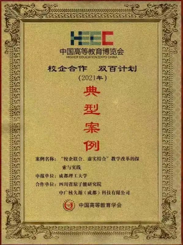 近日,中國高等教育學會公布了2021年度中國高等教育博覽會“校企合作 雙百計劃”典型案例名單,由成都理工大學、四川省原子能研究院、中廣核久源(成都)科技有限公司(簡稱“中廣核久源”)聯合選送的《“校企聯合、虛實結合”教學改革的探索與實踐》成功入選。