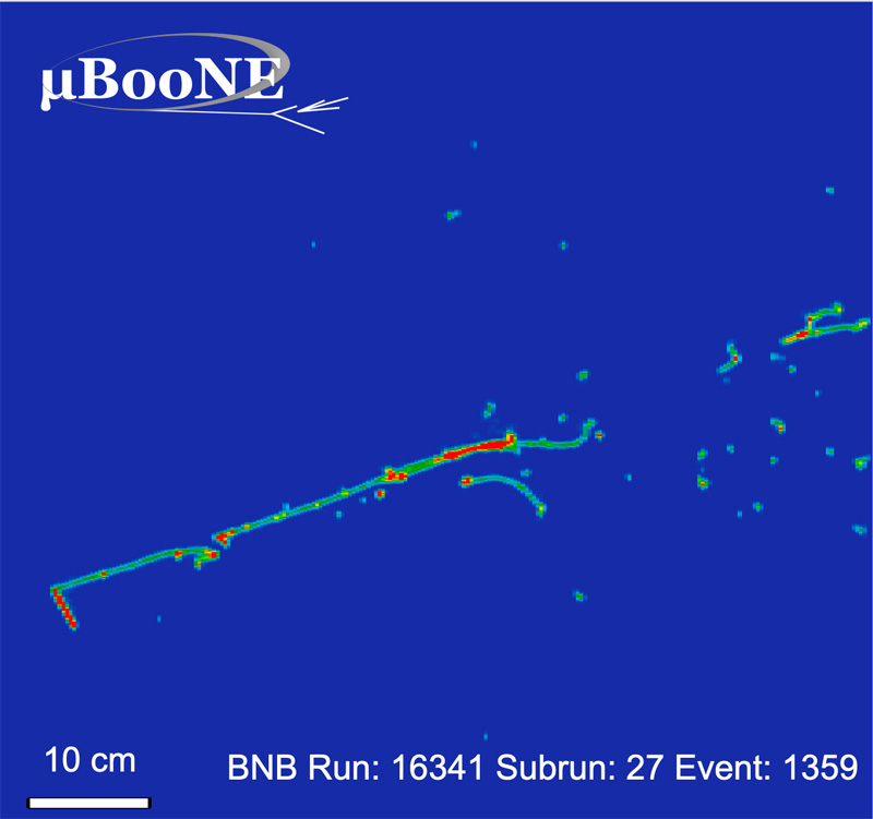 MicroBooNE 先進的液氬技術使研究人員能夠捕獲粒子軌跡的詳細圖像。這個電子中微子事件顯示了一個電子陣雨和一個質子軌跡。圖片:MicroBooNE 合作