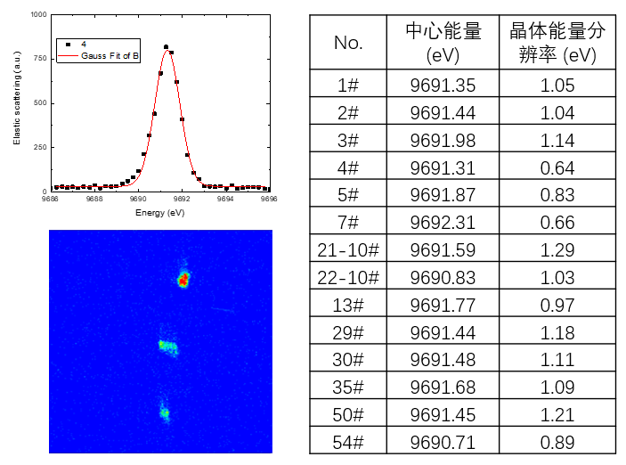 在HEPS工程指揮部的部署下,HEPS高能量分辨譜學線站團隊與光學設計、光學機械、光束線控制系統相關人員,聯合多學科中心晶體實驗室積極攻關。線站核心成員郭志英、多學科中心晶體實驗室刁千順,經過多年技術攻關和反復嘗試,不斷改進優化分析晶體制備工藝,最終探索出兼顧能量分辨與聚焦特性于一體的球面彎曲分析晶體制備方法。今年10月2日-5日,項目團隊在北京同步輻射裝置(BSRF)1W2B線站上,采用Si(111)雙晶單色器Si(220)切槽單色器兩次單色化、毛細管微聚焦的光學配置,利用自研三元譜儀樣機,對譜儀單模組內15塊分析晶體(圖1),采用EPICS-Bluesky控制系統實現單色器聯動掃描,開展了批量、高精度指標測試(裝置見圖2)。優化后入射能量帶寬實現高分辨,達到半高全寬0.8eV@9.7keV,分析晶體自身能量分辨(圖3)達到半高全寬~1eV@9.7keV,與理論預測值相當,聚焦特性得到充分驗證(圖3、圖4),各項指標全部滿足工程設計需求。