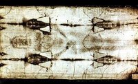 在意大利都靈大教堂范圍之內的薩夫瓦公爵世家的一座小禮拜堂里,保存著一塊十四尺五す長、三尺八寸寬的亞麻布,傳說這是哪穌的裹尸布(圖5-3),布上隱隱約約有一個人的前身和后身的影像。這塊布每一百年大約只拿出來公開展覽四次,每次展覽,遠近成千上萬的教徒都趕來仰。