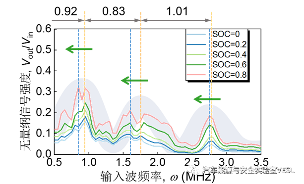 第一步,我們組合了兩對探頭的試驗結(jié)果,得到了一個較寬范圍的簡諧波掃頻測試結(jié)果。對不同SOC下的結(jié)果進行無量綱化之后,我們得到了無量綱信號強度隨收入波頻率變化的震蕩衰減趨勢。