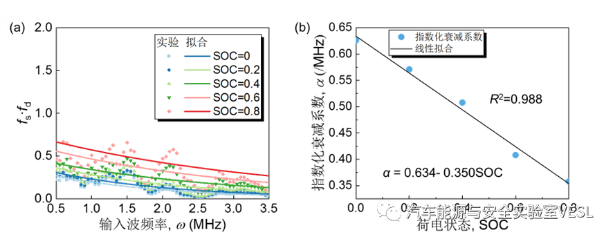 式中:fs是超聲波表面耗散后的透射率;fg是周期性結(jié)構(gòu)導(dǎo)致的層間耗散透射率;fd是超聲波阻尼耗散的透射率。fs受電池表面粗糙度、耦合劑質(zhì)量和探頭與電池接觸壓力等外部因素影響;而fg和fd不受外部因素影響,只和電池內(nèi)部的電化學(xué)性質(zhì)有關(guān)。fg可以通過計算解析模型計算得到。如果將圖1中的試驗結(jié)果與圖4中的解析結(jié)果進行組合,計算fg·fd,結(jié)果如圖5(a)所示。隨著輸入波頻率的增加,fg·fd呈現(xiàn)出逐漸衰減的趨勢。對這個衰減的趨勢進行指數(shù)化擬合:fs ·fd=A·e-αω(2)