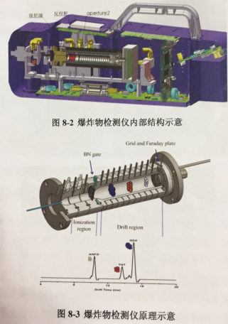 爆炸物在制作、加工等處理過程中總會留下氣體或固體顆粒形式的殘留物、通過搜集這些殘留物并對其進行分析,從而判斷是否存在爆炸物。使用離子遷移光譜技術檢測儀的檢測原理是:首先,加熱樣品,使所收集的化學物質氣化:其次,氣化后的化學物質由一個干凈的干燥空氣流作為載體,帶入一個反應區:第三,反應區有一個弱的放射源,放射源發出射線,照射樣品流中的氣體顆粒,形成正離子和負離子,同時,沿探測器的整個長度施加有一個電場,在電場的作用下,不同的離子以不同的、但卻是特有的速度進行漂流,并在不同的漂流時間內到達收集器的電極;最后,具有不同質量的離子將產生不同的漂流圖譜或波形圖,從而分辨出是否為爆炸物(圖8-2、圖8-3)。