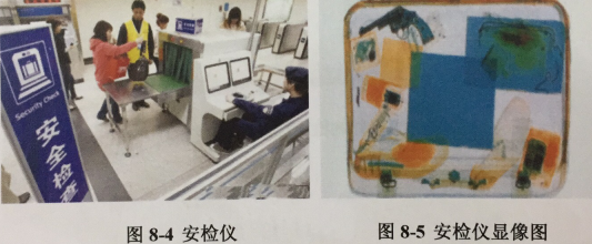 這是因為安檢儀內部有1臺X光機,能發出X射線,產生的X射線照射行李包裹并在穿透行李后,電腦會自動根據反饋回來的X射線強度對圖像進行渲染處理,使得不同密度的物品在屏幕上反差極大,一眼就能識別其形狀(圖8-5)。