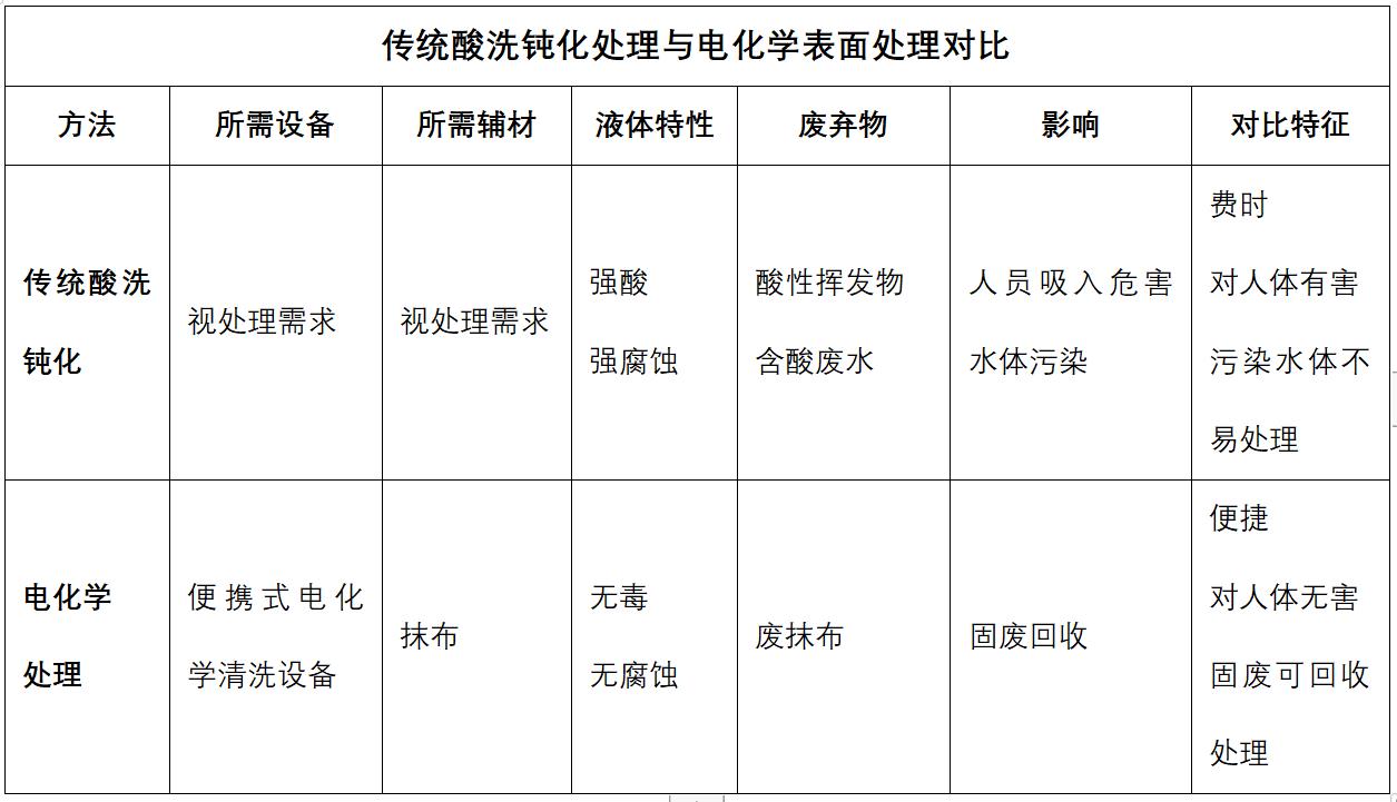 傳統(tǒng)的不銹鋼焊縫表面處理,采用鈍化膏涂抹或強酸浸泡,并使用大量清水沖洗。該工藝費時費力、酸類物質(zhì)揮發(fā)影響作業(yè)人員健康,并產(chǎn)生大量的酸性廢水無法有效處理。采用電化學(xué)方法進行不銹鋼焊縫的表面處理,利用了逆變原理,配合專用的功能性清洗與中和液體,采用碳纖維刷頭蘸取液體或中置管路持續(xù)供液的方式定向?qū)缚p進行清洗,完工后用抹布擦干焊縫。此種方式無需對焊縫表面進行沖洗,杜絕廢水的產(chǎn)生,僅需對擦拭用的抹布進行回收。同時,針對所使用的液體,選擇了無毒無腐蝕的配方,使用過程中揮發(fā)物無毒性,清洗后焊縫表面不殘留鹵素、硫、鐵素體等污染,在確保清洗效果的同時,杜絕對人體及環(huán)境的危害,并有效規(guī)避了焊縫表面的腐蝕風(fēng)險。