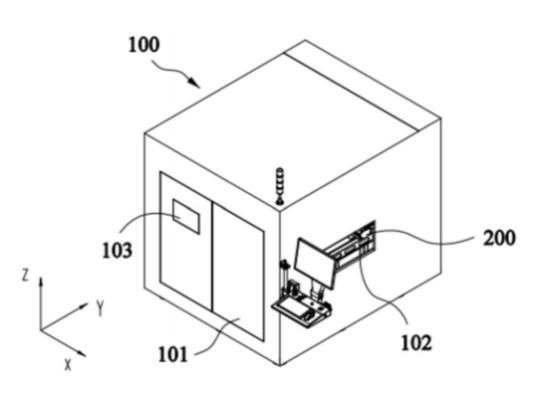 如上圖,為該專利中公開的X射線無損檢測設備的結構示意圖,該X射線無損檢測設備包括鉛房100、輸送機構200、光管組件300以及探測裝置。其中,鉛房上設有第一送料口102和第二送料口,第一送料口和第二送料口設置在鉛房相對的兩個側壁上,第一送料口處設有可開合的第一防護鉛門。