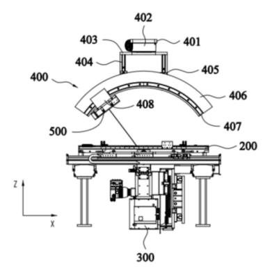 如上圖,為省卻鉛房的X射線無損檢測設備的結構示意圖,該旋轉機構包括固定座401、旋轉軸402和軸承。固定座固定在鉛房頂部的內側,旋轉軸安裝在固定座上,軸承設置在固定座與旋轉軸之間,旋轉軸能夠在固定座內實現360°旋轉,旋轉軸的中心軸與Z軸方向平行。