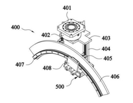 最后,上圖為探測裝置結構的局部放大示意圖,其中,弧線運動機構包括第二連接板406、第二滑軌407和第二滑塊408。第二連接板固定在第一滑塊上,該方案中定義X軸和Z軸所形成的平面為第一平面,第二連接板與第一平面平行設置,第二滑軌設置在第二連接板上,第二滑塊能夠沿第二滑軌滑動,探測器設置在第二滑塊上。