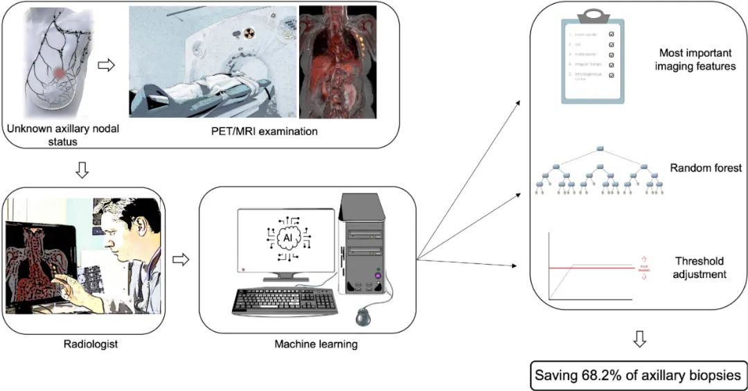 圖形摘要:新診斷的乳腺癌患者接受PET/MRI掃描以研究腋窩淋巴結受累情況。然后,放射科醫師根據易于評估的形態學和代謝性淋巴結標準,評估是否存在淋巴結受累(淋巴結陽性對淋巴結陰性)。基于這些數據,訓練隨機森林模型。因此,確定了與淋巴結狀態評估相關的最重要的淋巴結標準。通過調整閾值,現在可以通過隨機森林的方式增加靈敏度,使得68.2%的患者可以省去腋窩活檢。