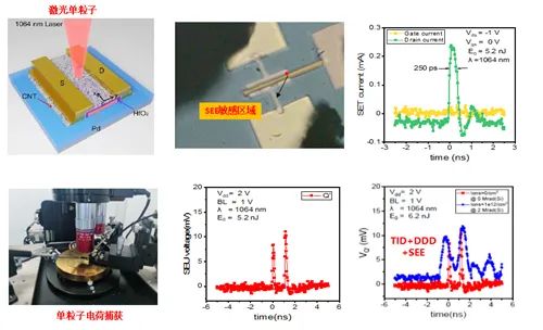 中國科學院國家空間科學中心太陽活動與空間天氣重點實驗室副研究員陳睿、研究員韓建偉團隊與北京大學電子學院教授張志勇課題組、中科院微電子研究所研究員李博課題組合作,針對碳納米管晶體管和靜態隨機存儲器單元,利用空間中心自主建立的脈沖激光模擬重離子試驗裝置、質子與電子加速器和集成電路試驗與仿真平臺,揭示了碳納米管場效應晶體管和存儲單元單粒子效應損傷機理和響應特性。該研究發現,碳納米管器件和電路柵區域對單粒子效應敏感,且損傷機制與傳統體硅器件單粒子敏感體積收集輻射感生電荷不同,單粒子離化電子受電場作用向源極漂移形成溝道電流(約250ps脈寬的瞬態電流脈沖),空穴在柵介質上累積導致柵電場強度增加是單粒子損傷的主要機制。