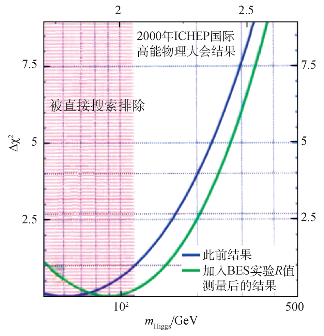 值得一提的是,我國的北京正負電子對撞機(Beijing Electron Position Collider,BEPC)及其上的北京譜儀(Beijing Spectrometer,BES)實驗也為間接約束希格斯玻色子質量做出了重要貢獻。R值是粒子物理中可以直接反映夸克味(flavor)與色(color)量子數的基本物理量,是電弱精確擬合的重要輸入測量。在2000年前后,BES實驗在2—5 GeV的能區精確測量了R值[13],其平均誤差僅有6.6%,比之前的實驗減小了2到3倍。在納入這一測量結果后,當時的電弱精確測量擬合給出的希格斯玻色子最可幾質量從過去的62 GeV升高到了90 GeV,上限也由原來的170 GeV更新為210 GeV(圖4)。這一重要測量為發現希格斯玻色子指明了更為精確的方向。法國物理學家博列克·彼得日克(Bolek Pietrzyk)是在LEP上通過實驗數據進行標準模型希格斯粒子質量擬合工作的負責人,他在2000年國際高能物理大會報告希格斯粒子質量擬合結果時指出:“沒有這一結果(北京譜儀R值結果),我們可能已排除了標準模型希格斯粒子(without this result,we could have excluded the Standard Model Higgs)”。