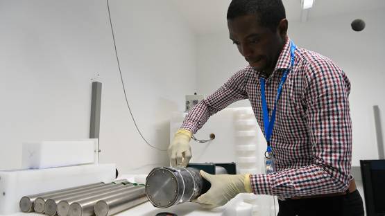 Francois Idjiwole 在奧地利塞伯斯多夫的新原子能機構設施中操作中子發生器。(照片:D. Calma/國際原子能機構)