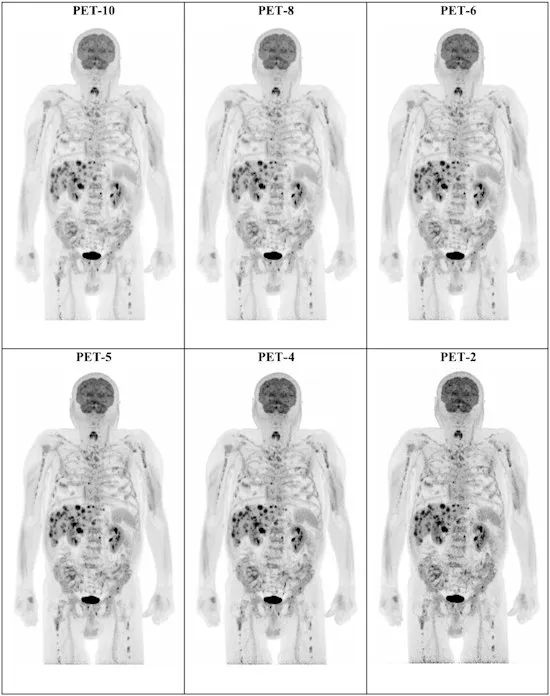 最大強度投影(MIP) F-18 FDG-PET圖像的例子,一名74歲患有IV期皮膚黑色素瘤的男子計劃用免疫檢查點抑制劑治療。介紹了PET-10、PET-8、PET-6、PET-5、PET-4和PET-2的采購情況。所有的采集都清楚地顯示了擴散的F-18嗜FDG轉移性疾病。圖片和說明由歐洲核醫學和分子成像雜志提供。
