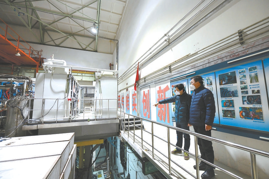 北京譜儀Ⅲ實驗國際合作組發言人、中科院高能物理所研究員李海波(右)與北京譜儀Ⅲ實驗國際合作組聯合發言人、中國科學院大學教授呂曉睿(左)在北京譜儀對撞區查看設備情況。 本報記者 和冠欣攝
