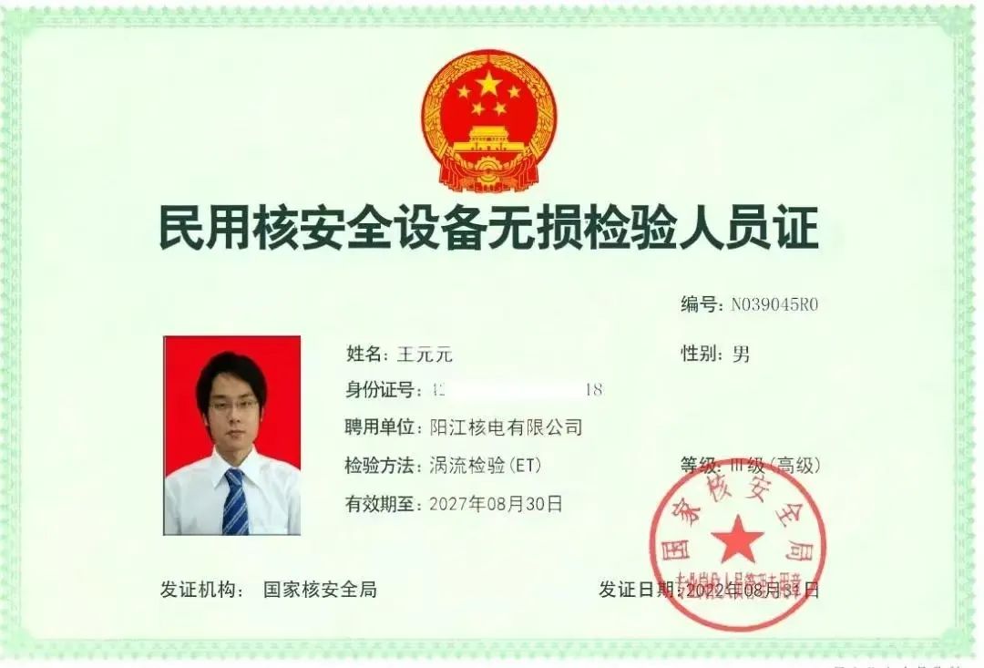 該III級證書的取得,使陽江核電廠在國內率先具備渦流檢測獨立數據分析、獨立審批報告、獨立開發特殊檢測工藝的資格與能力,陽江核電廠在無損檢測領域有了新的突破。