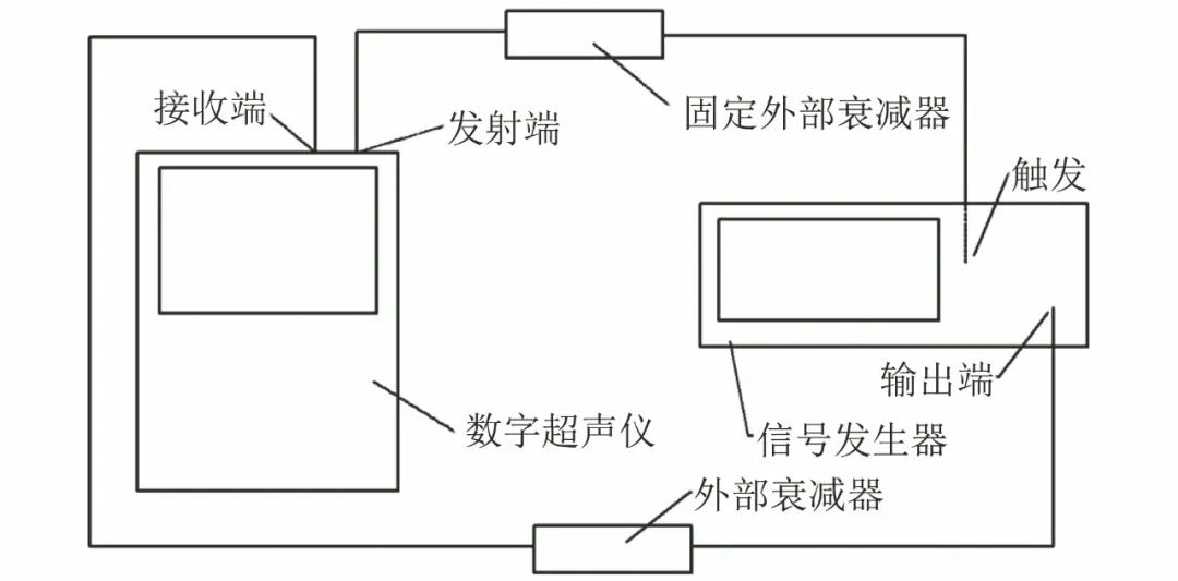 所用的設(shè)備有:經(jīng)過校準的信號發(fā)生器,經(jīng)過校準的外部衰減器兩個。按標準要求的配置方式,連接信號發(fā)生器和超聲儀,如圖1所示。