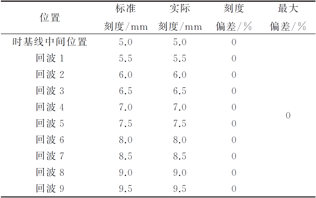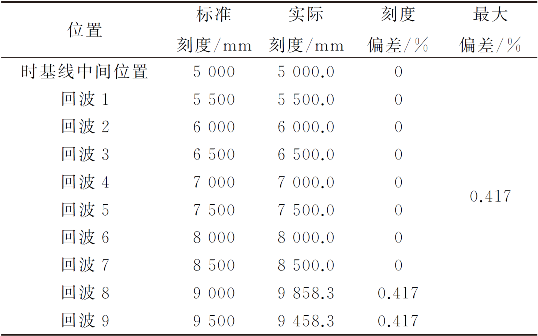 調(diào)節(jié)超聲儀的工作方式為一發(fā)一收,材料聲速設(shè)為5940 m/s,頻帶選擇為2~8 MHz,中心頻率為3.57 MHz。將超聲儀時基線設(shè)置為0~10 mm,0~400 mm,0~10000 mm三個范圍,按順序分別進行測試。以0~10 mm為例,此時在時基線中間位置5 mm處獲得波高為全屏幅度80%的顯示信號,以全屏寬度5%的增量(即0.5 mm),改變信號發(fā)生器的觸發(fā)延遲(0.168 μs),記錄每段延遲后顯示信號在顯示屏上的位置。三個時基線范圍的時基線性測試數(shù)據(jù)如表1~3所示(標準允許的線性偏差最大為全屏寬度的±0.5%)。