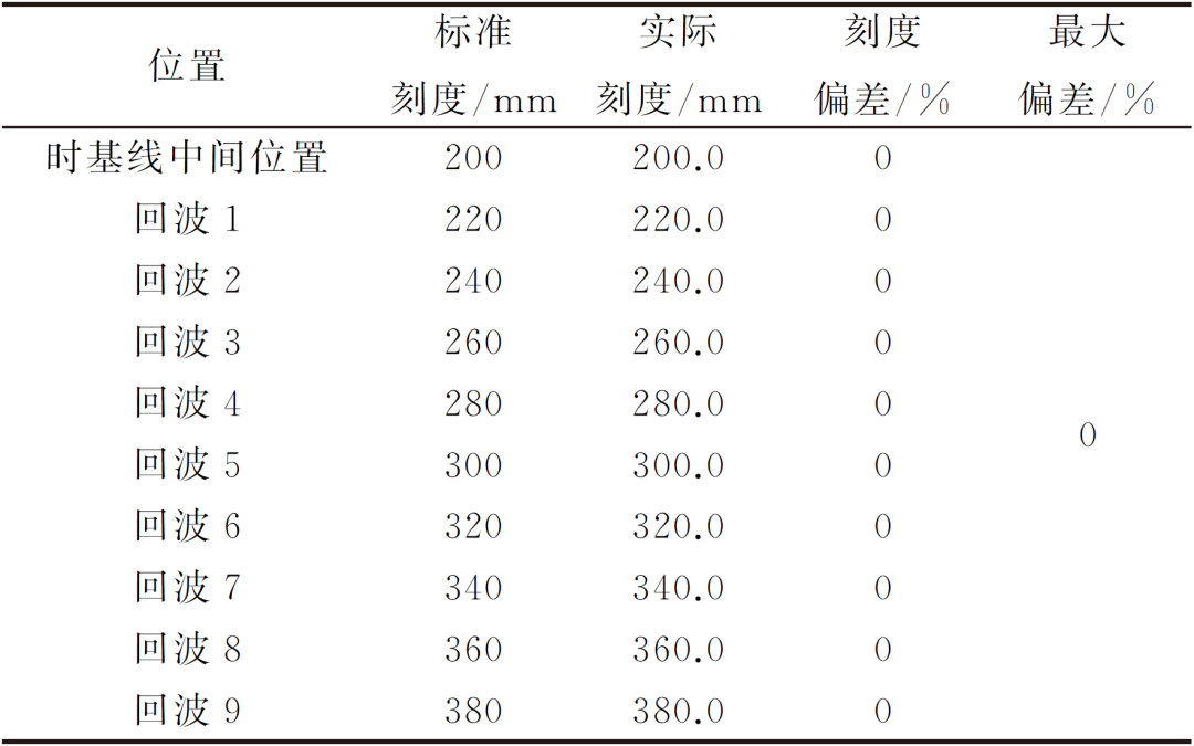 調(diào)整外部衰減器、發(fā)生器信號幅度和超聲儀增益,使超聲儀上的測試信號幅度為全屏幅度的80%。調(diào)整超聲儀時基范圍為100~200 mm,使第3個信號對準全屏寬度的20%,第9個信號對準全屏寬度的80%。記錄其余9個信號的刻度偏差(見表4,標準允許的最大線性偏差為全屏寬度的±1%)。