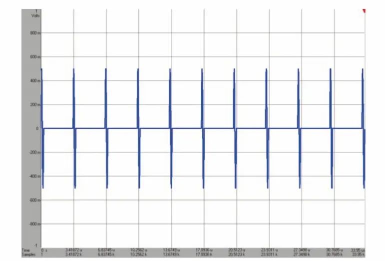 采用9.6節(jié)的方法測試時基線性所用的設(shè)備與8.7節(jié)的一致,但需信號發(fā)生器能導(dǎo)出11個等間距的正弦波脈沖串。使用任意函數(shù)信號發(fā)生器自帶的編程軟件編輯出11個等間距的正弦波,如圖2所示,中心頻率為3.57 MHz。考察超聲儀在100~200 mm間時基線性的準確性,規(guī)定正弦波自身長度為0.28 μs,任意兩個相鄰正弦波間隔3.087 μs。將該正弦波串導(dǎo)入信號發(fā)生器,仍采用圖1的儀器配置方式,超聲儀參數(shù)的設(shè)置方法與8.7節(jié)的方法一致。