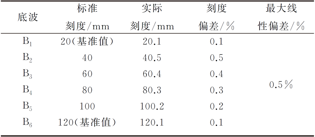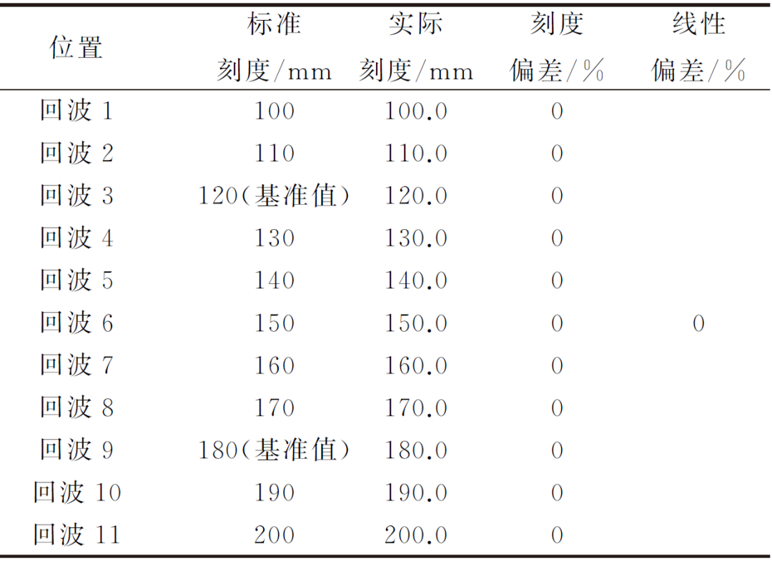 先對探頭進行自動調(diào)校,輸入起始距離為20 mm,終止距離為120 mm,調(diào)整時基線,使B1對準全屏寬度的0%、B6對準全屏寬度的100%,依次將回波調(diào)至全屏幅度的80%,檢查B2~B5這四個回波與標準刻度的偏差(見表5,標準允許的最大線性偏差為全屏寬度的±2%)。