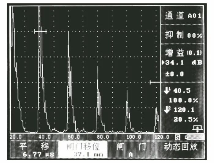 使用的探頭型號為2.5P20Z,選用CSK-ⅠA試塊,檢查20~120 mm范圍內(nèi)的時基線性。調(diào)整超聲儀,使屏幕上出現(xiàn)B1~B6共6次底波,如圖3所示。