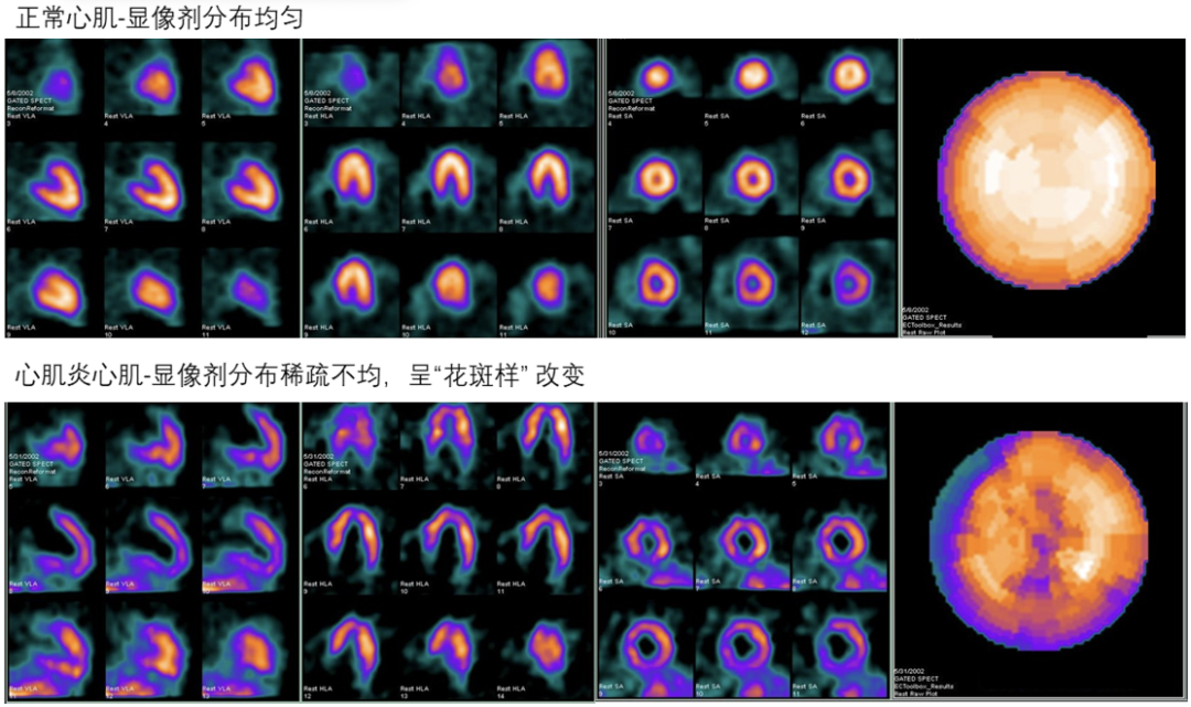 那么,在臨床中該如何早期診斷病毒性心肌炎或心臟微血管內皮損傷呢?心電圖、心肌酶、超聲心動圖都是檢測病毒性心肌炎的重要方法(4)。心臟磁共振除了輔助診斷心肌炎,還有助于排除其他形式的心肌病(5)。目前,心內膜活檢仍是診斷心肌炎的金標準,但屬于有創檢查,實際開展的很少(6)。對于新冠后有胸痛、胸悶不適、懷疑心肌損傷而心電圖和心肌酶譜正常的患者,可以進行核素心肌血流灌注顯像進行輔助診斷。