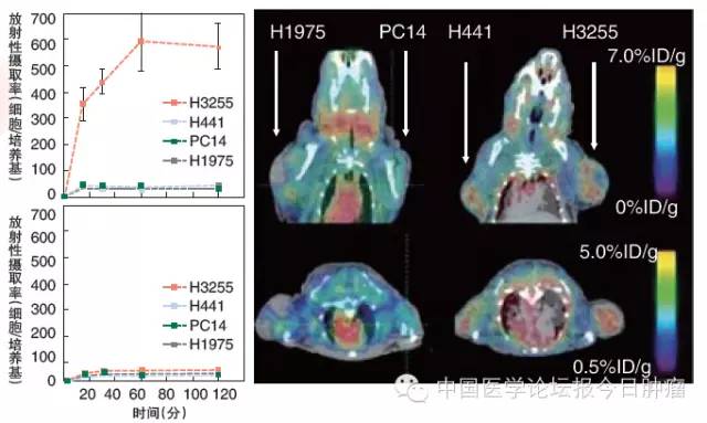 圖1 離體實(shí)驗(yàn)證實(shí)EGFR L858R突變的H3255細(xì)胞對該探針[(18F)F-PEG6-IPQA]有明顯高攝取,100 μm/L吉非替尼存在情況下明顯抑制探針攝取。荷瘤裸鼠模型注射探針120 min后行PET/CT成像,結(jié)果顯示EGFR L858R突變的H3255腫瘤模型腫瘤區(qū)探針明顯高攝取(%ID/g表示每克組織攝取的放射性劑量占注入總放射性劑量的百分比)