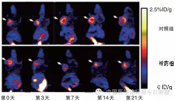 圖2 構(gòu)建18F-FPPRGD2特異性血管靶向分子成像探針,實(shí)現(xiàn)了整合素αvβ3的可視化(上圖);18F-FDG成像證實(shí)了該新型探針成像的準(zhǔn)確性(下圖)