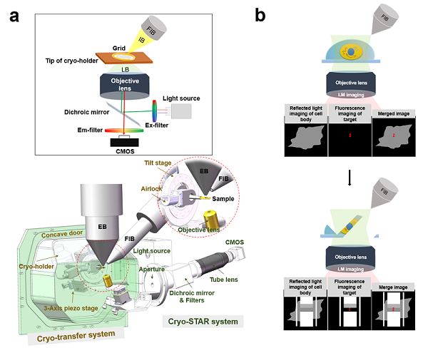 圖1.ELI-TriScope的設計原理。(a)ELI-TriScope的光路原理圖(上)及系統設計圖(下)。IB,離子束。LB,光束。EB,電子束。FIB,聚焦離子束。(b) ELI-TriScope的工作原理示意圖。離子束和光束同時聚焦在冷凍樣品中感興趣的區域,反射光成像(灰色)顯示細胞輪廓,熒光信號(紅色)用于實時監控cryo-FIB精準減薄。